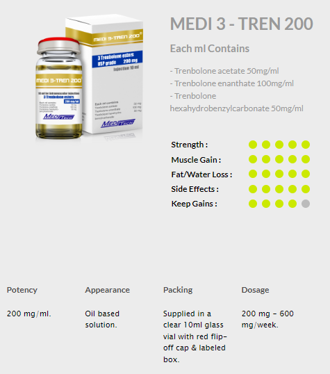 Trenbolone acetate 50mg/ml and Trenbolone enanthate 100mg/ml and Trenbolone hexahydrobenzylcarbonate 50mg/ml 1 UNITS MEDI 3-TREN 200 MEDITECH (excluded of 20 USD Postage fee/order)